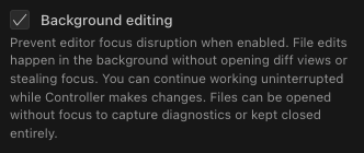 Work without interruption while Controller edits files in the background—no more losing focus from automatic diff views.