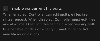 Concurrent File Edits allows Controller to modify multiple files in your workspace within a single request. Instead of approving each file edit individually, you review and approve all changes at once through a unified batch approval interface.