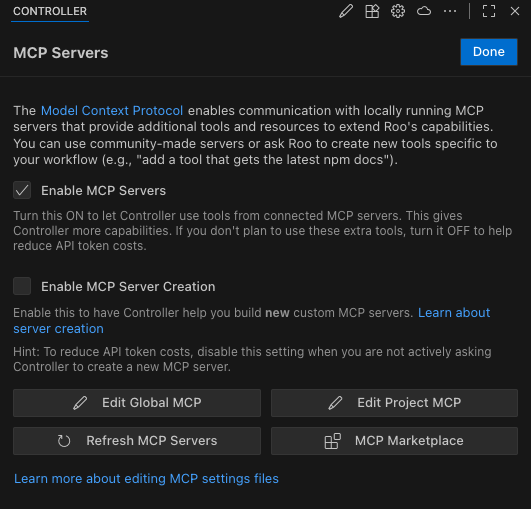 - Open the Controller MCP settings panel by clicking the icon.