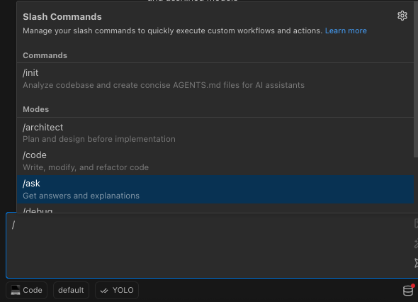 The slash menu includes mode-switching commands (like /code, /ask) that fundamentally change the AI's operational mode - they don't just inject text but switch the entire AI context. Custom modes you create also appear as slash commands (e.g., a mode with slug reviewer becomes /reviewer). These mode commands cannot be overridden by custom workflow commands. Learn more in Using Modes and Custom Modes.